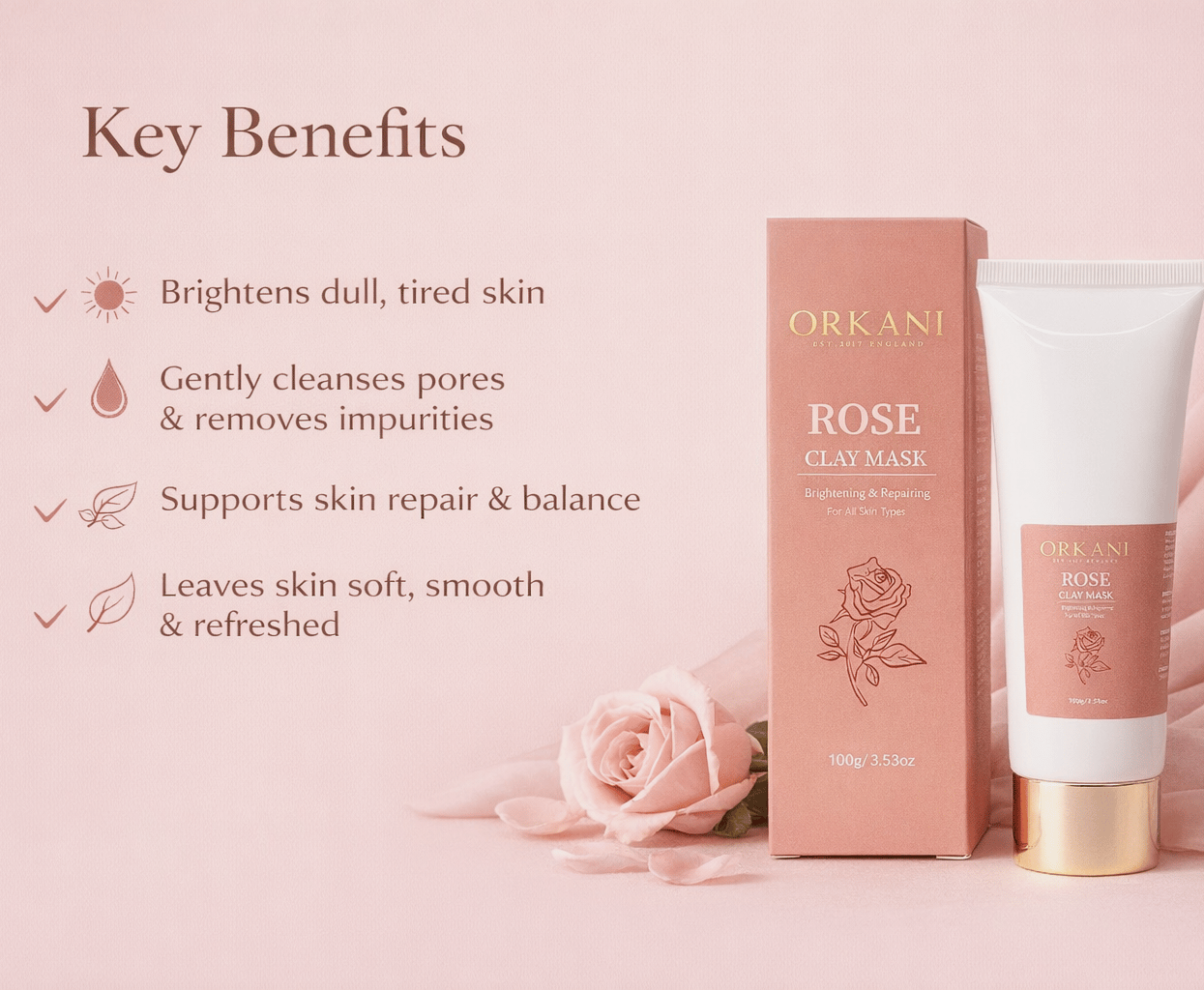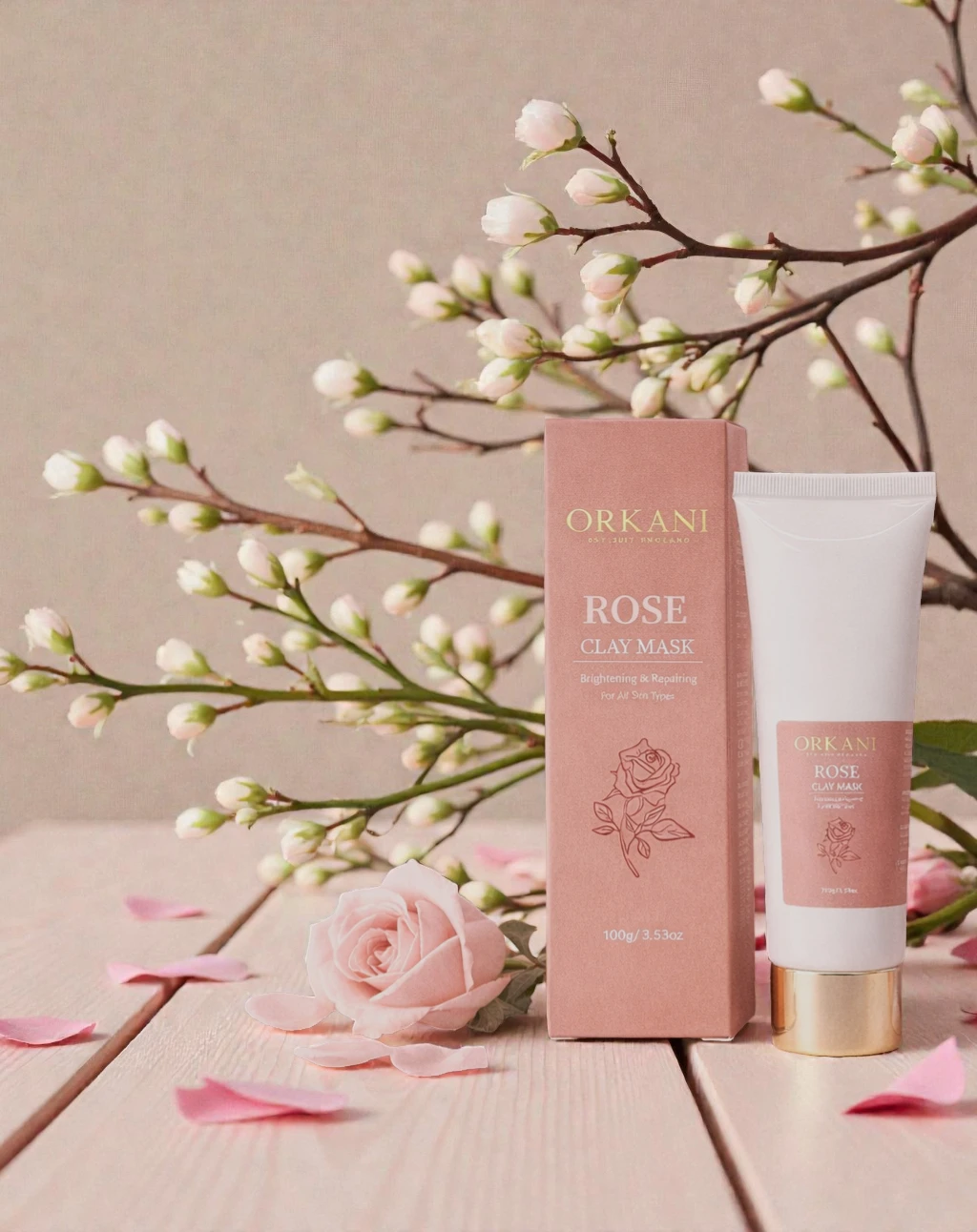 The Orkani Rose Clay Mask is a gentle yet effective facial treatment designed to cleanse pores, brighten dull skin, and support natural repair — all without stripping moisture.
